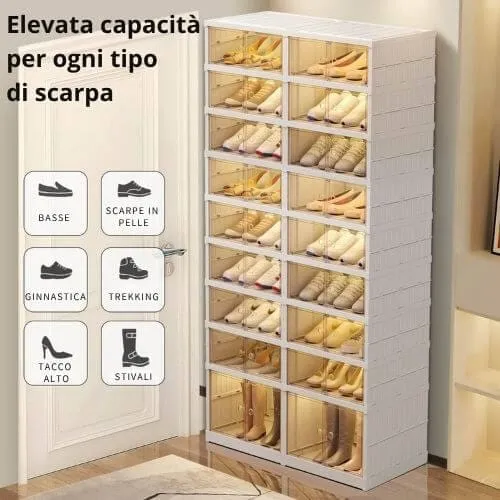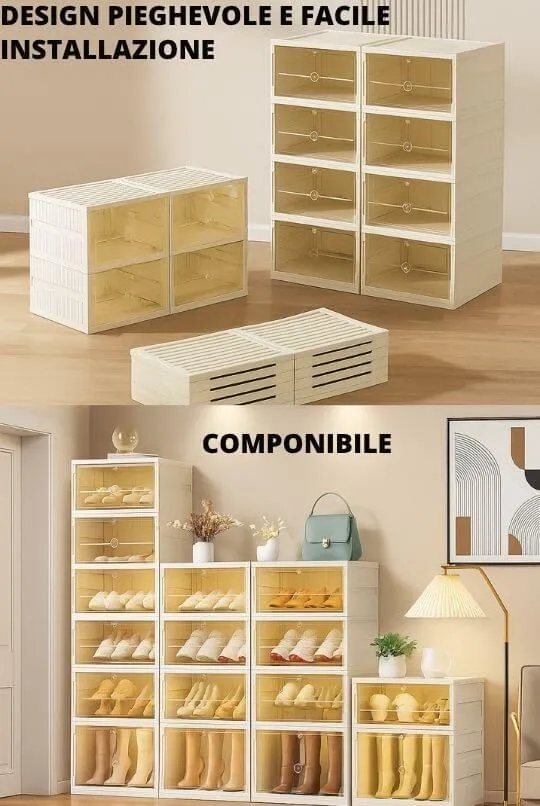 Qui bastano pochi gesti e hai una scarpiera stabile, pieghevole e subito pronta.